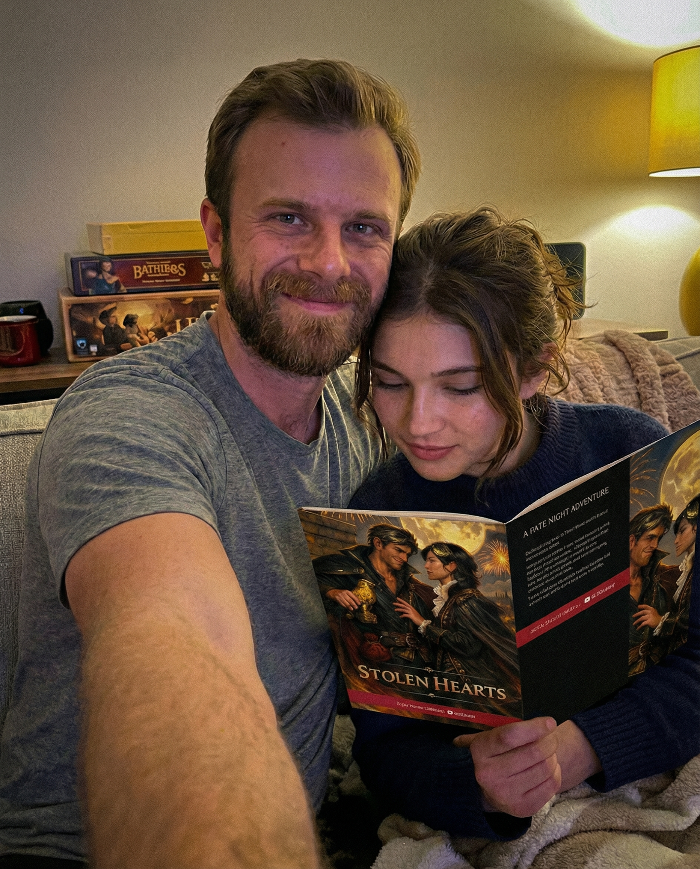 About 2-3 hours per story. Long enough to feel like a real adventure, short enough to fit in one evening. Three adventures means three date nights whenever you're ready for them.