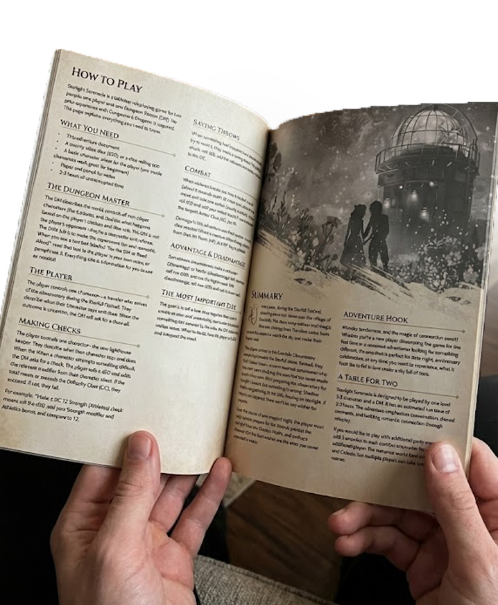 Nope. These adventures are built for beginners. There's a simple "How to Play" guide that explains everything - you can go from zero experience to playing in minutes. If one of you has played before, great. If neither of you has, even better. The rules stay out of the way so you can focus on the story.